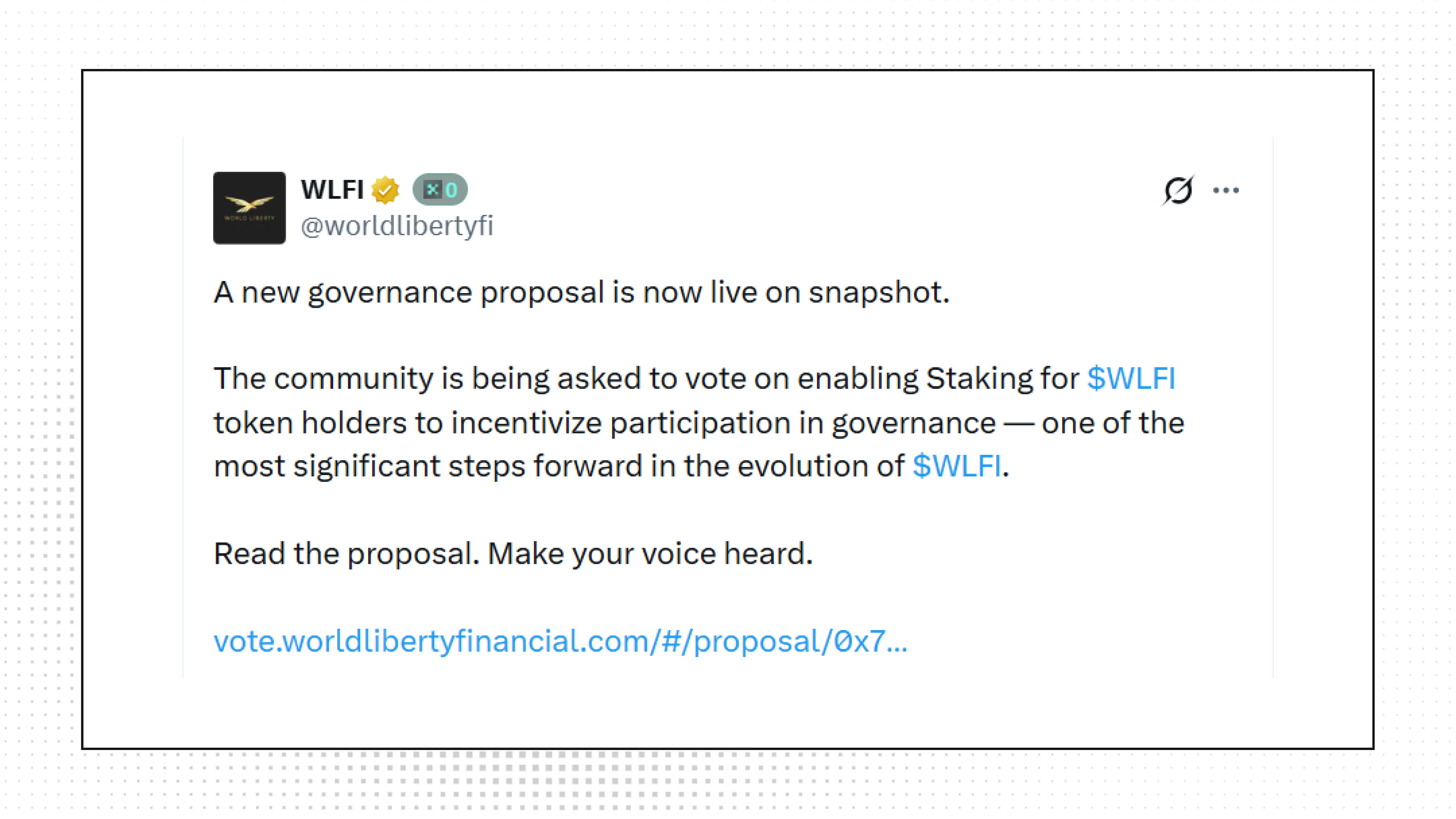 World Liberty Financial dropped a governance proposal asking the community to vote on enabling staking for WLFI token holders. This could be one of the most significant moves yet for the Trump-linked DeFi project, pushing holders toward active participation rather than passive holding.
