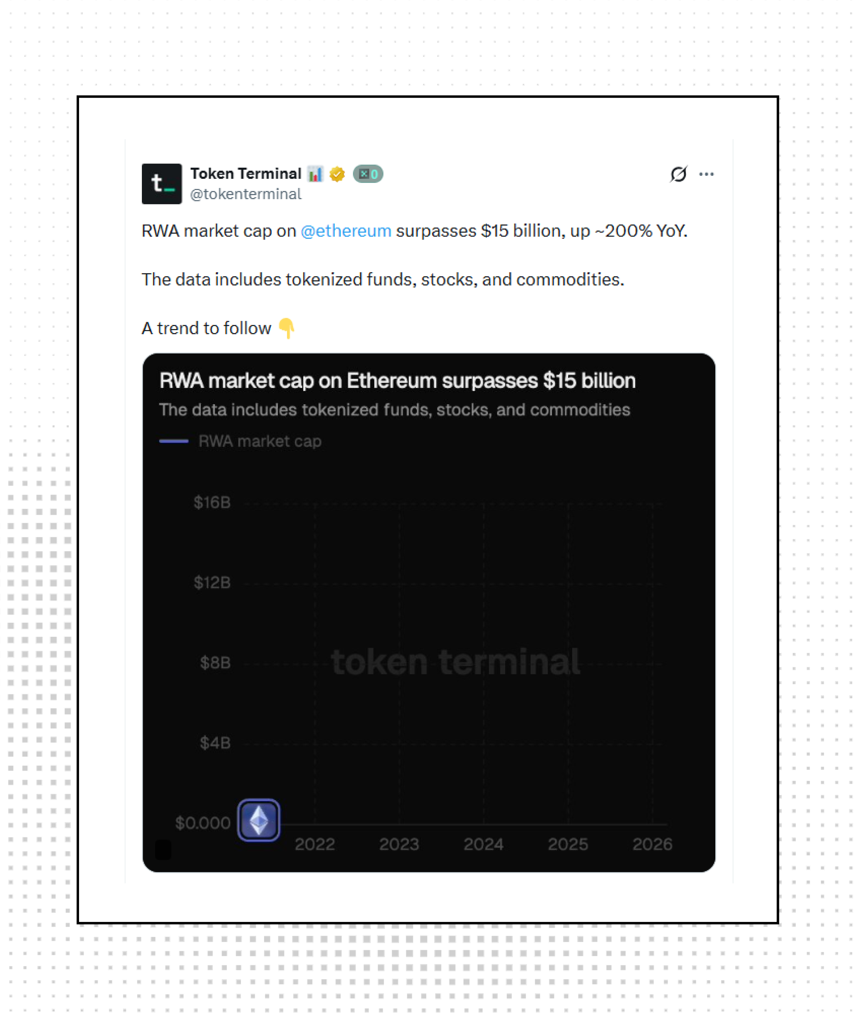 RWA market cap on Ethereum surpassed $15B, up roughly 200% year-over-year, according to Token Terminal. The data includes tokenized funds, stocks, and commodities, a trend worth watching as tradfi rails continue merging with onchain infrastructure.