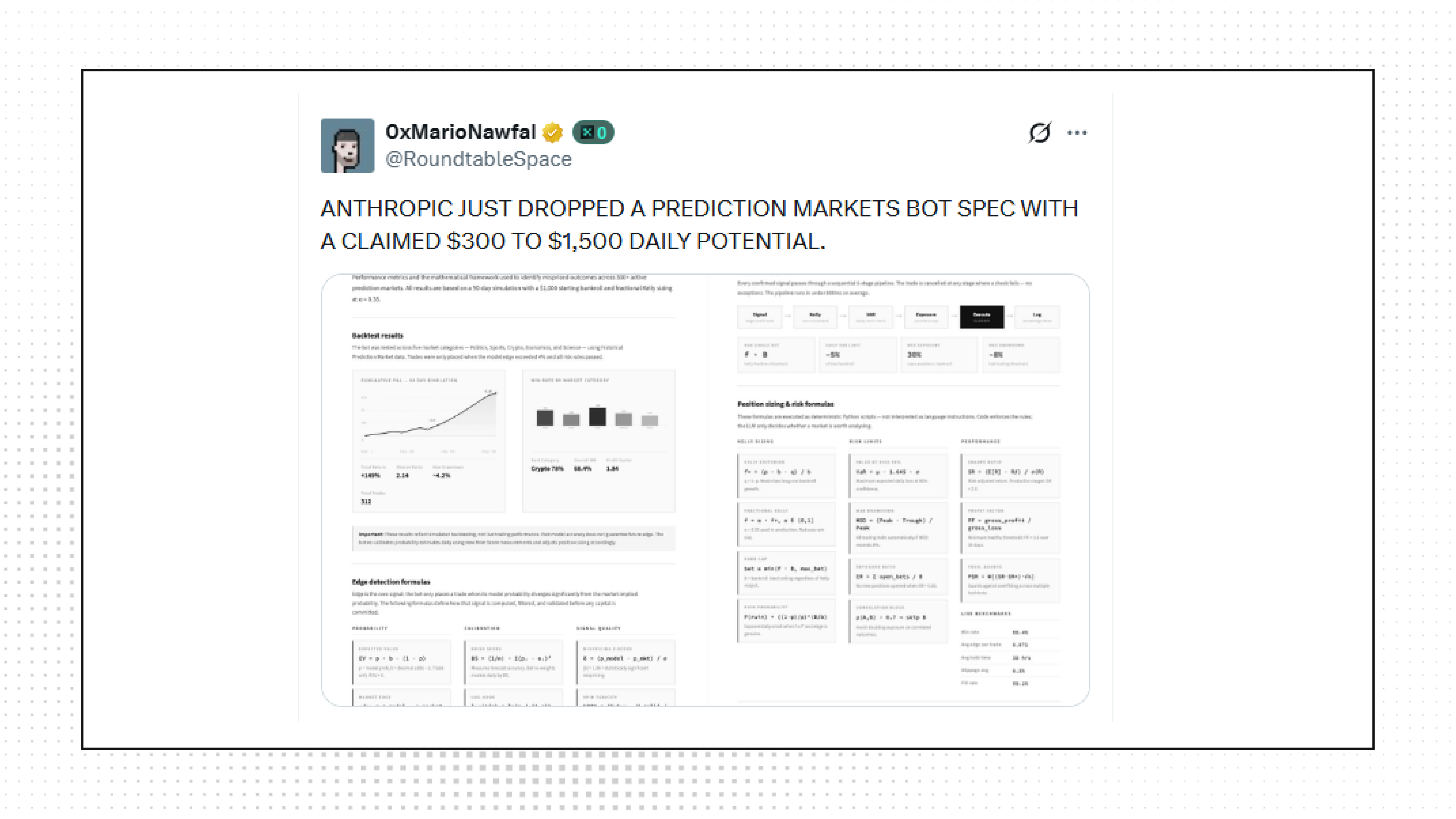 Posts on X claimed Anthropic released a prediction markets bot specification promising $300 to $1,500 daily earnings, including a 33-page cheat sheet for Claude skills and a trading bot with 68.4% win rate. Multiple users quickly debunked the claim, stating Anthropic posted nothing and labeling it disinformation or a hoax.