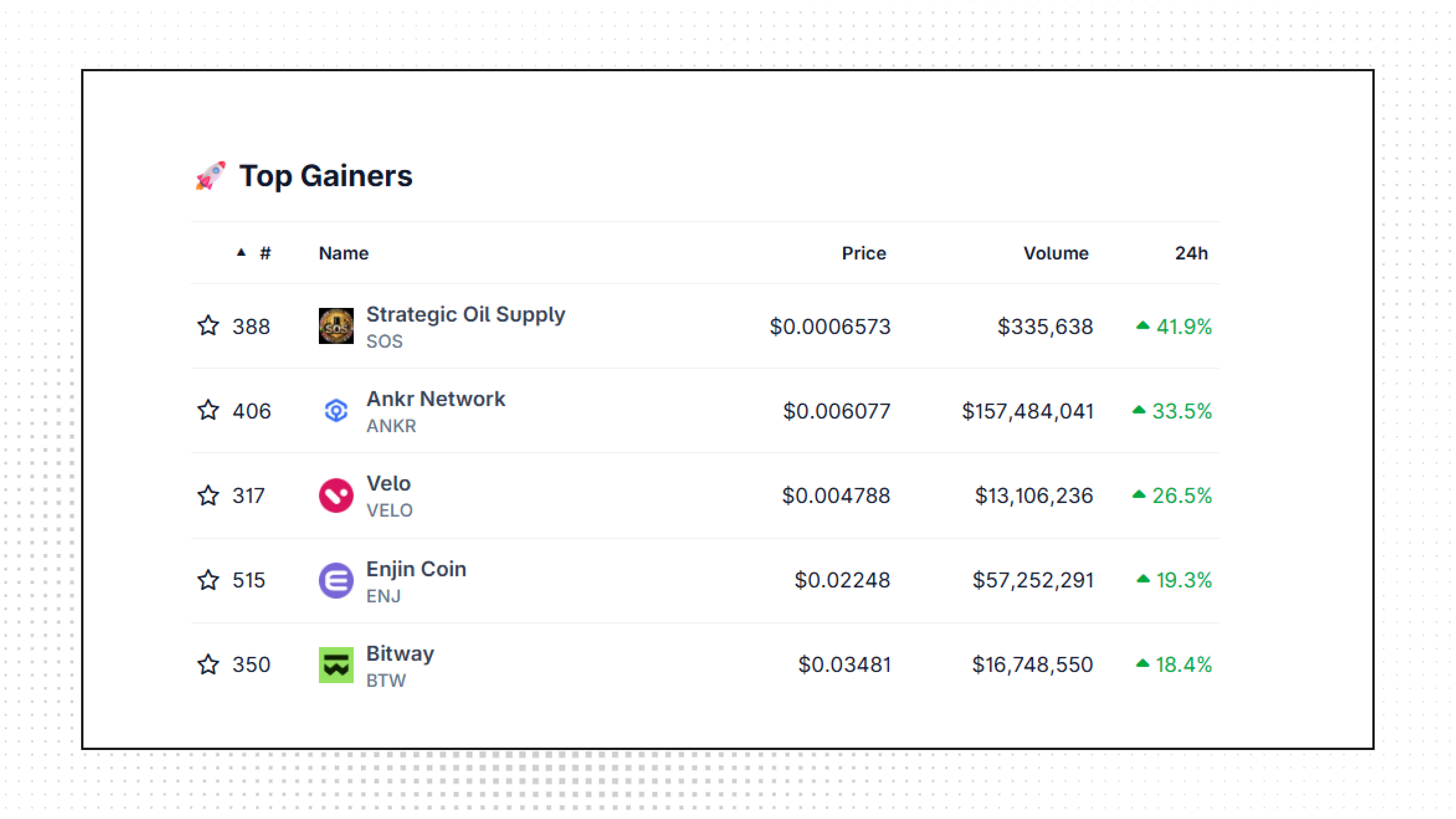 Top Gainers: SOS, ANKR, VELO, ENJ, BTW.