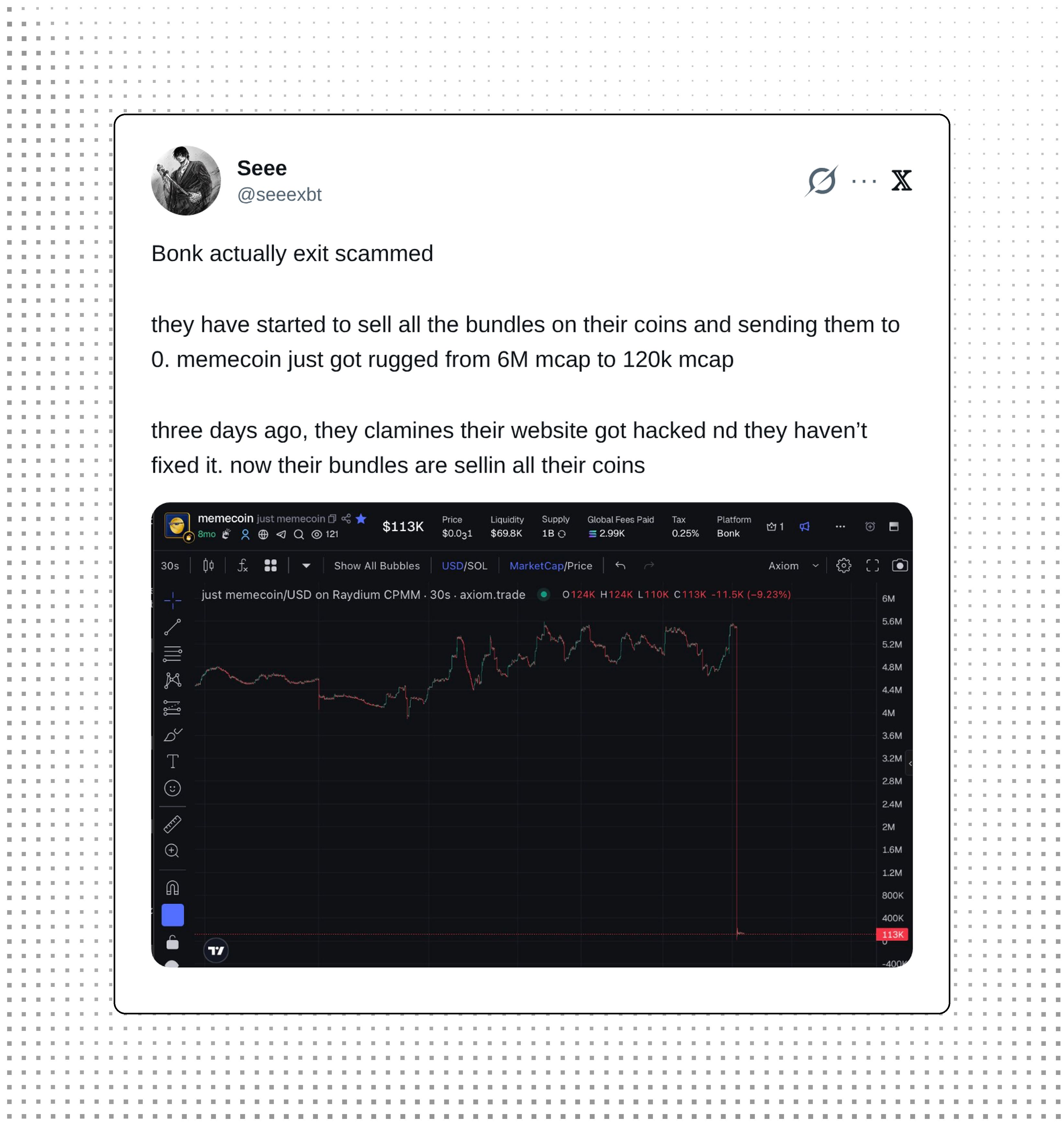 Bonk appears to have exit scammed, selling all bundles and sending tokens to zero. The memecoin collapsed from $6M market cap to $120K after the team claimed their website was hacked three days ago and never fixed it.