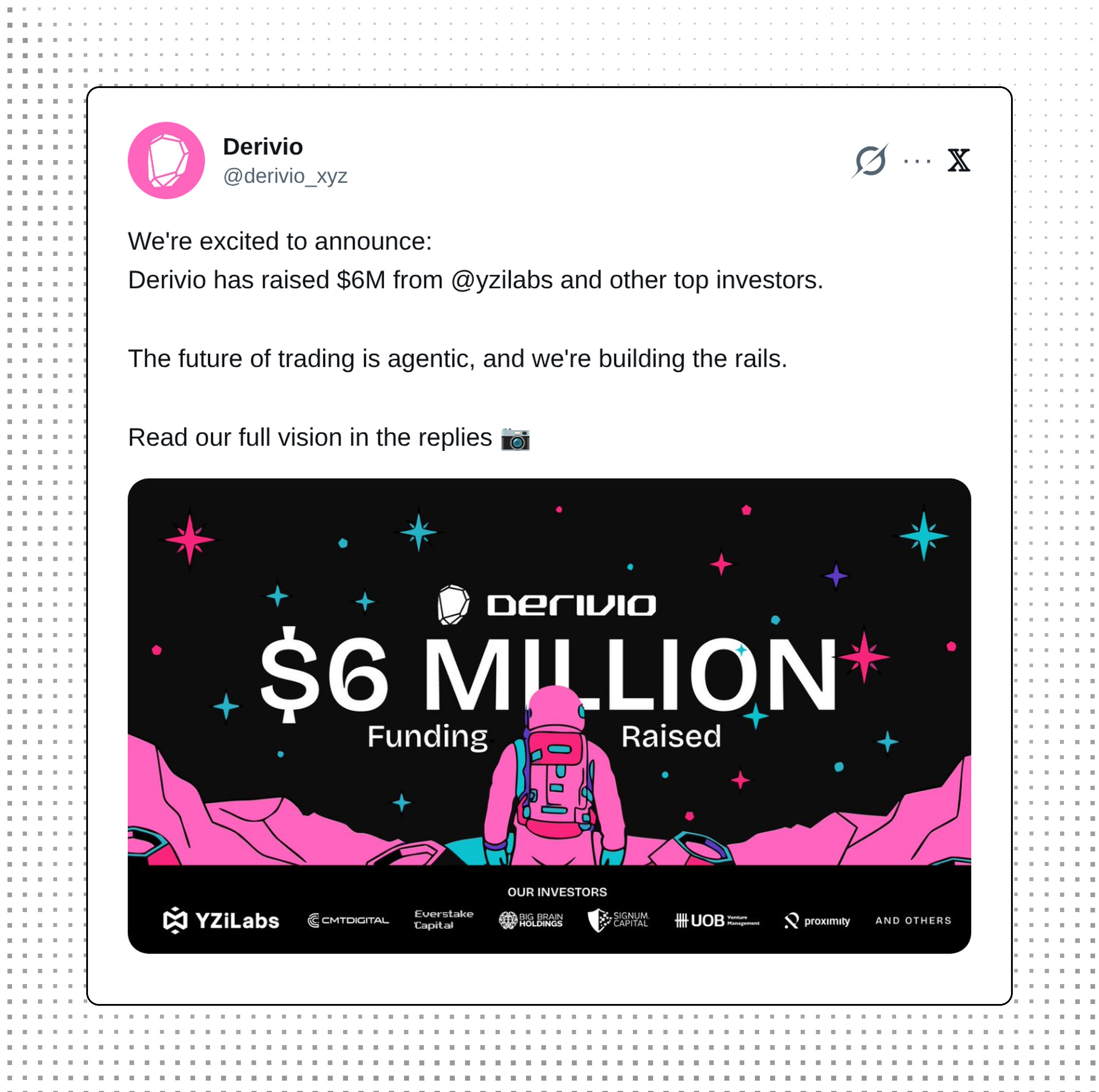 Derivio raised $6M from YZi Labs and other top investors to build agentic trading rails for the future of derivatives.