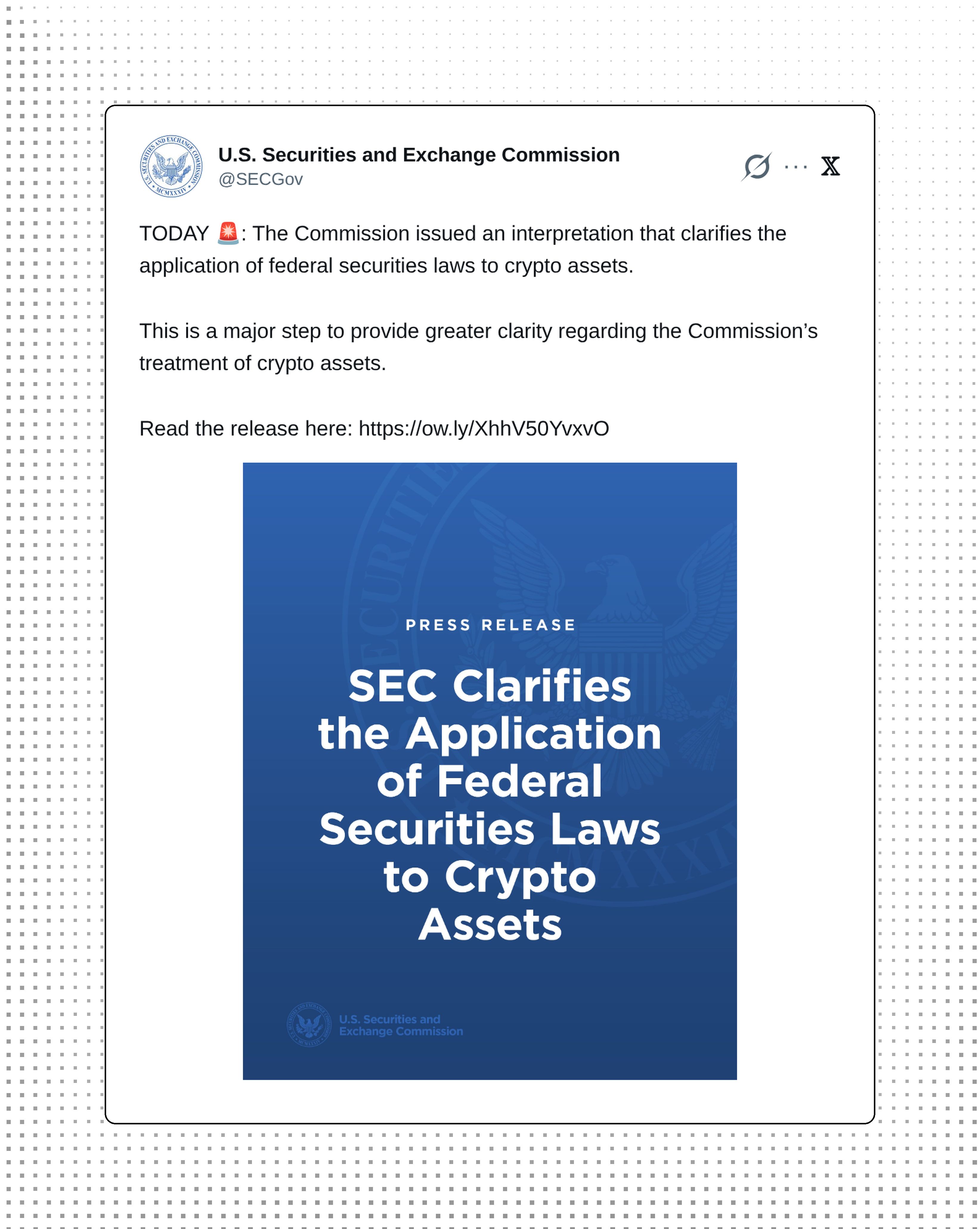 The SEC issued an interpretation clarifying the application of federal securities laws to crypto assets. This marks a major step toward providing greater regulatory clarity for the industry.