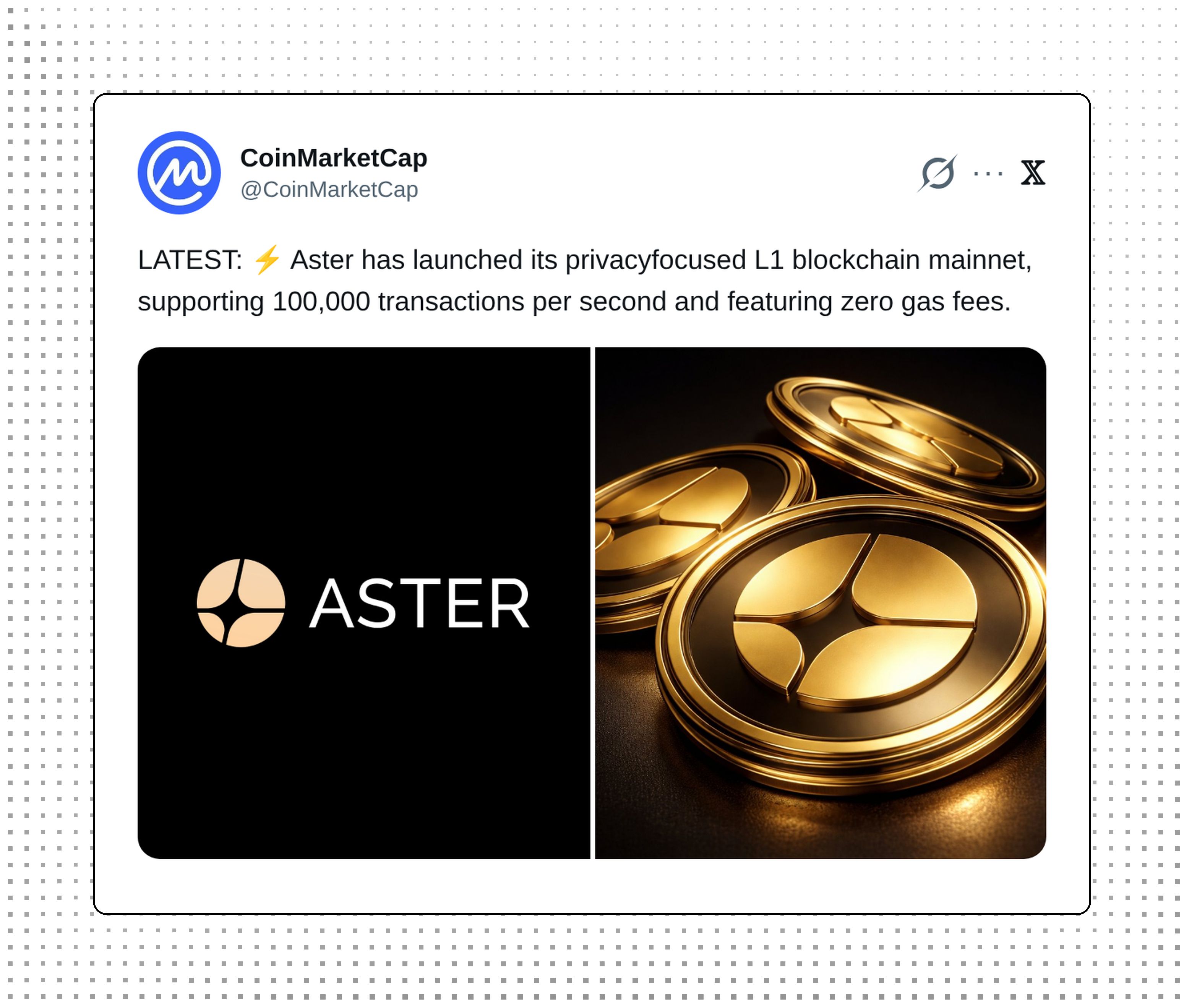 Aster launched its privacy-focused L1 blockchain mainnet, supporting 100,000 transactions per second with zero gas fees.