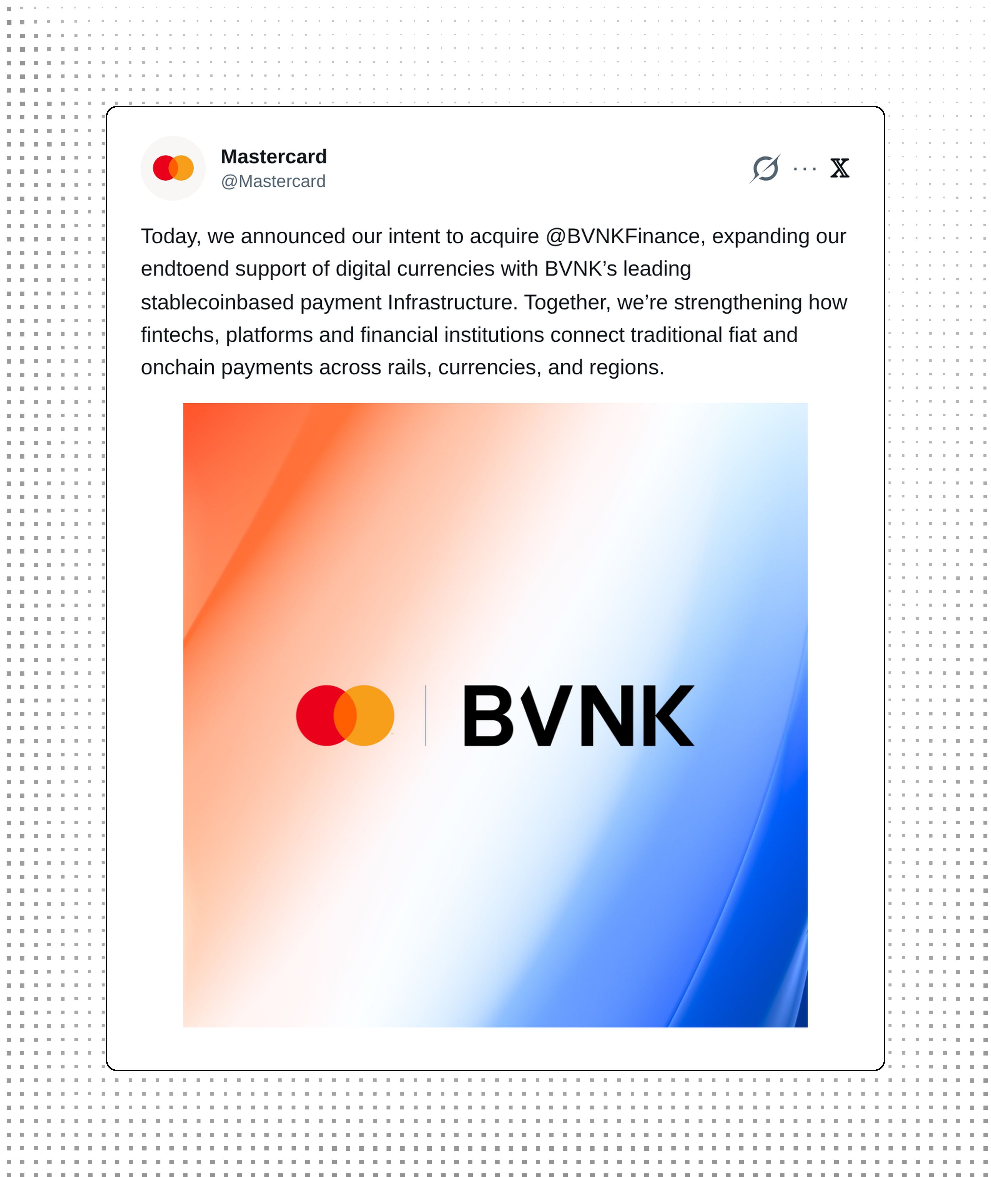 Mastercard announced its intent to acquire BVNK, a leading stablecoin-based payment infrastructure provider. The move expands Mastercard's end-to-end digital currency support, strengthening how fintechs and financial institutions connect traditional fiat with onchain payments across rails, currencies, and regions.