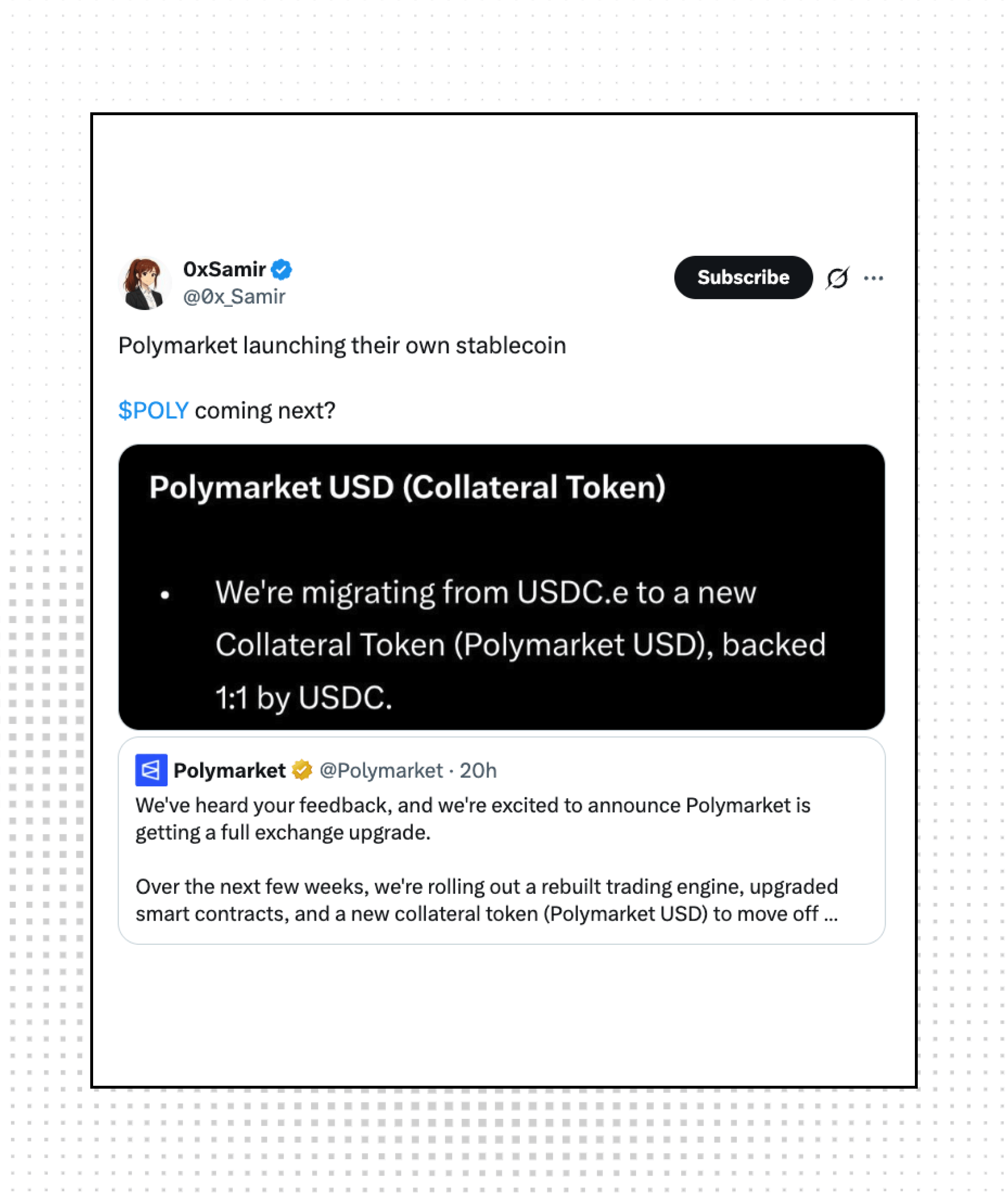Polymarket will migrate from USDC.e to a new Collateral Token named Polymarket USD backed 1:1 by USDC. Every application is a bank now with the power of stablecoins.