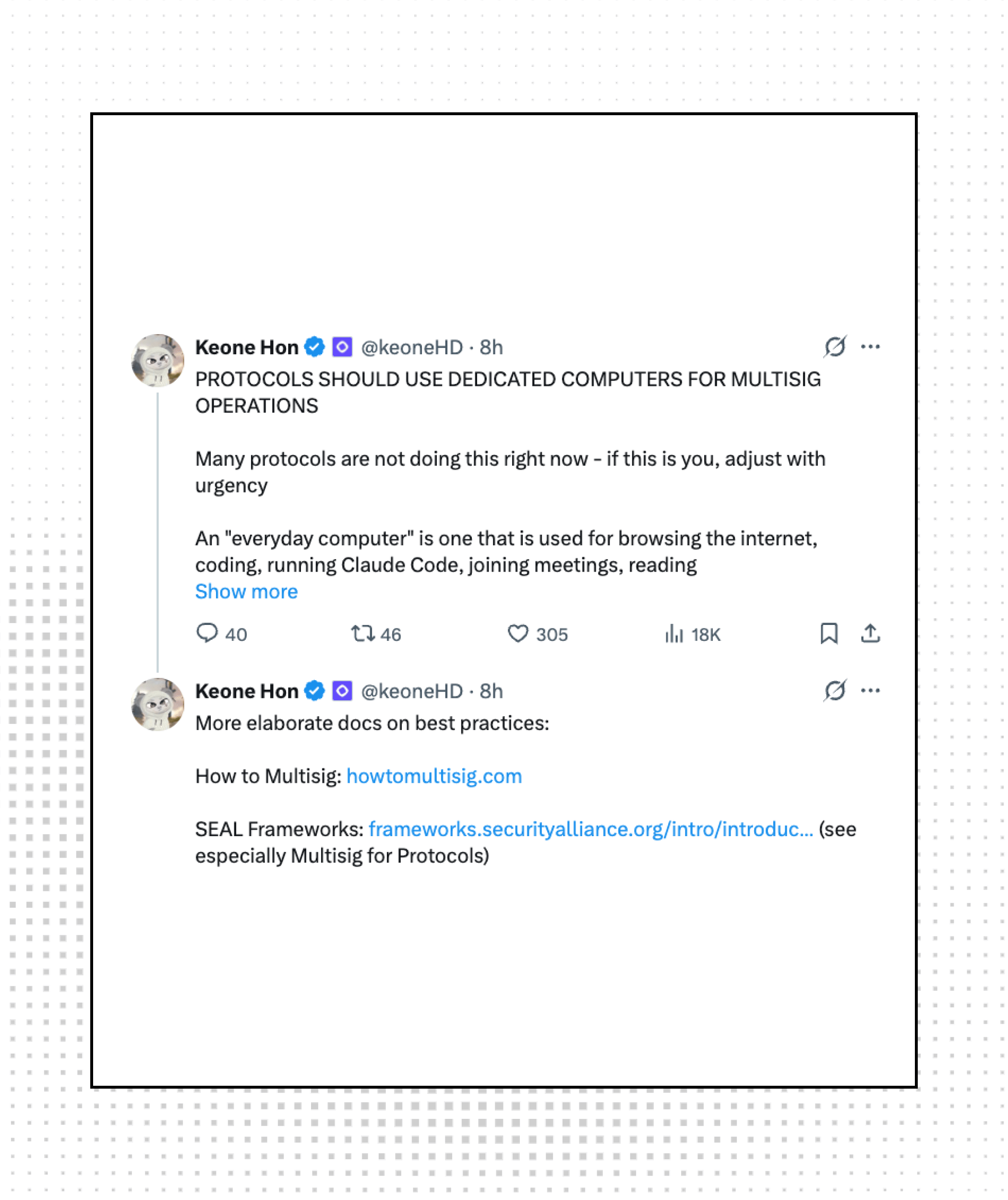 Monad co-founder Keone Hon urges all protocols to use dedicated computers for multisig signing operations. The post comes in the wake of Drift's $285M exploit, where contributors were compromised through everyday devices.
