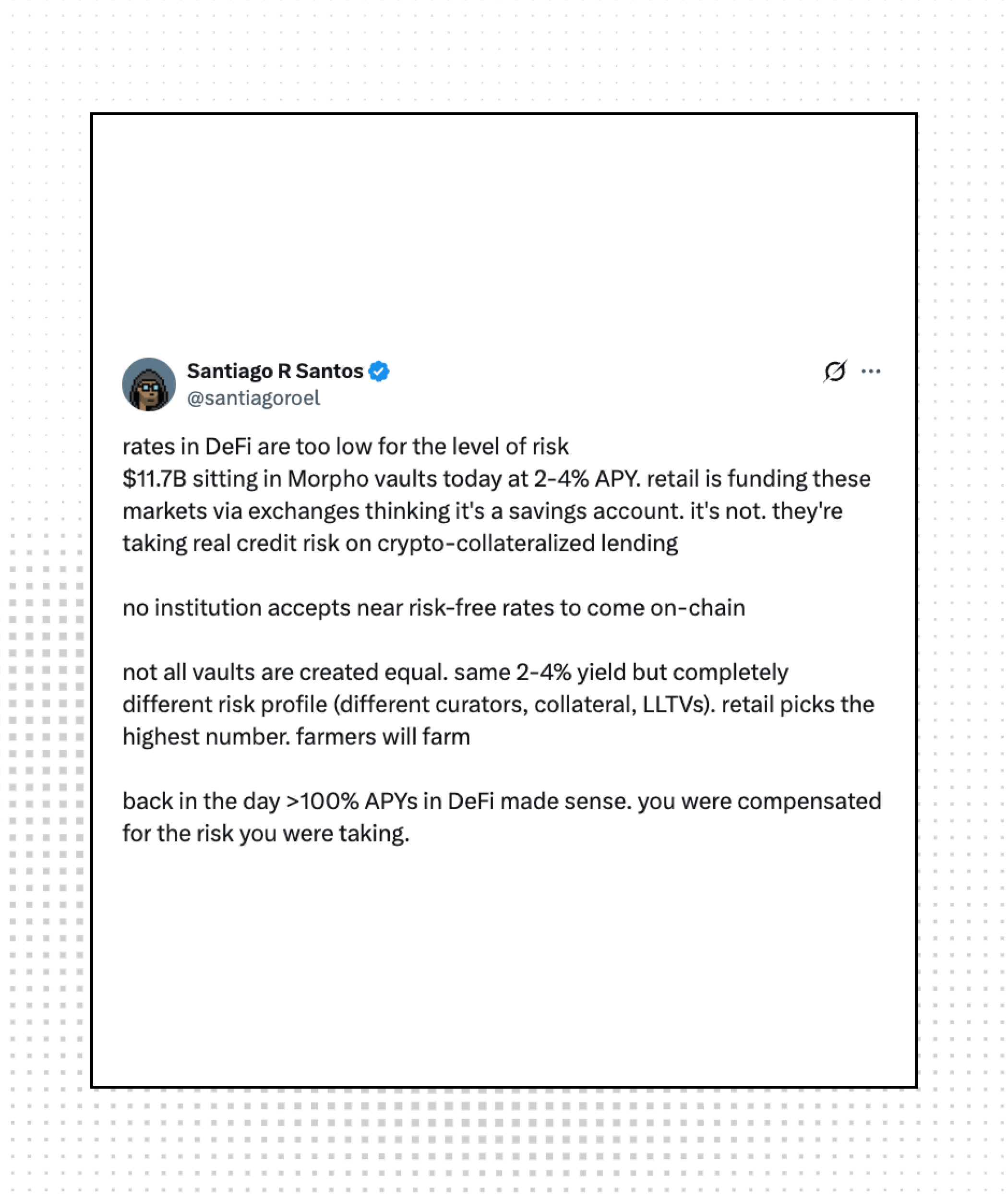 Santiago Santos argues DeFi lending rates are too low for the risk, with $11.7B sitting in Morpho vaults earning just 2–4% APY.