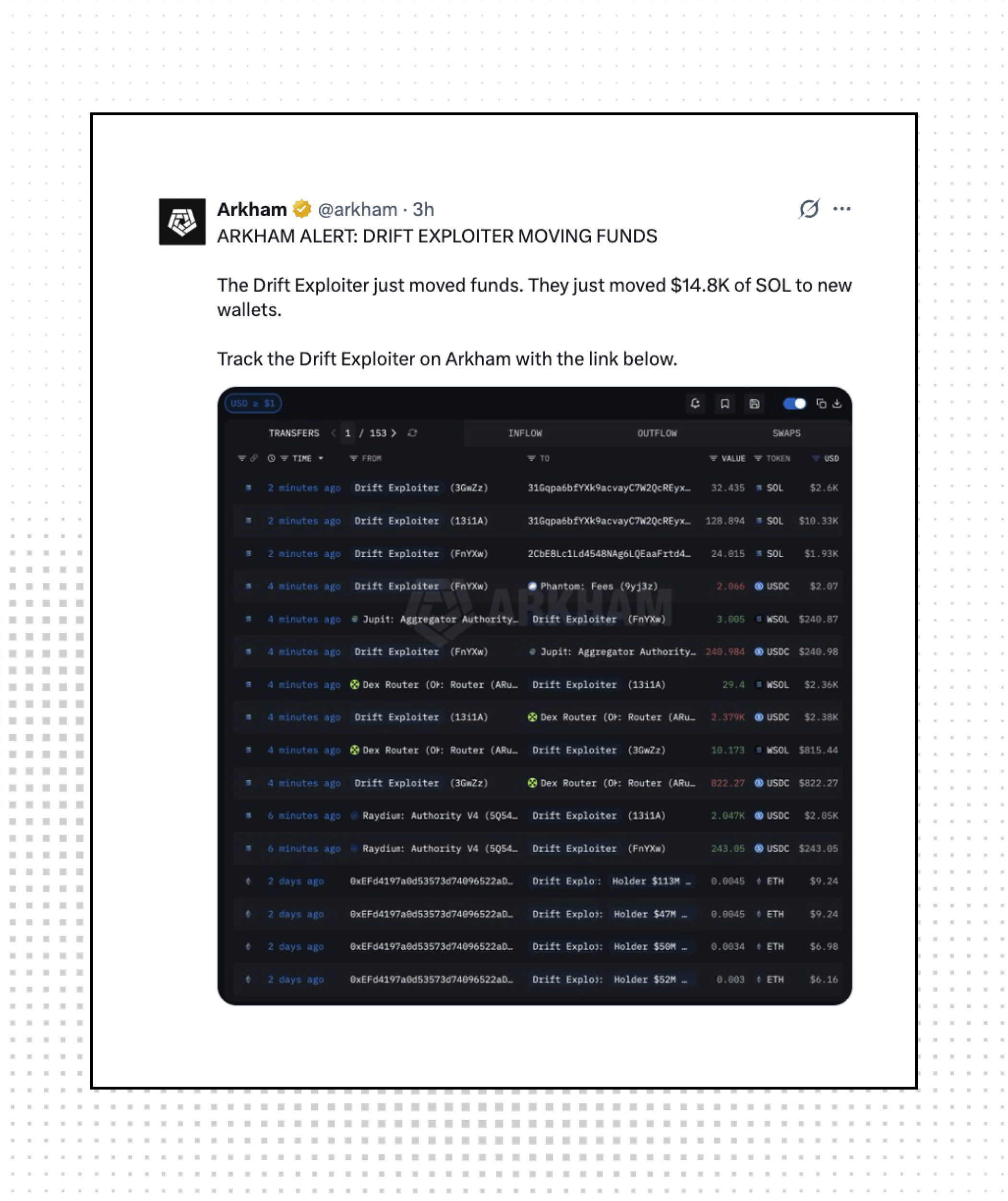 For our onchain sleuths, Drift exploiter has been moving funds. Roughly $14.8K SOL was moved to new wallets. We await the zachxbt in you; track the wallets using Arkham.