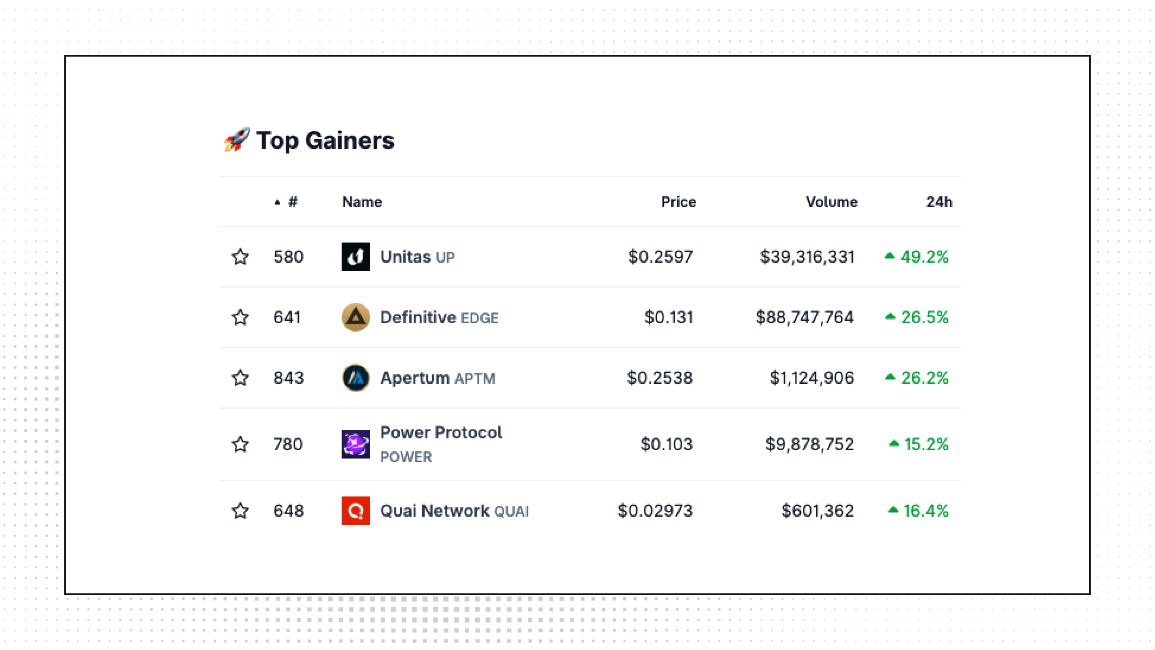Top Gainers: UP, Edge, APTM, POWER, QUAI.