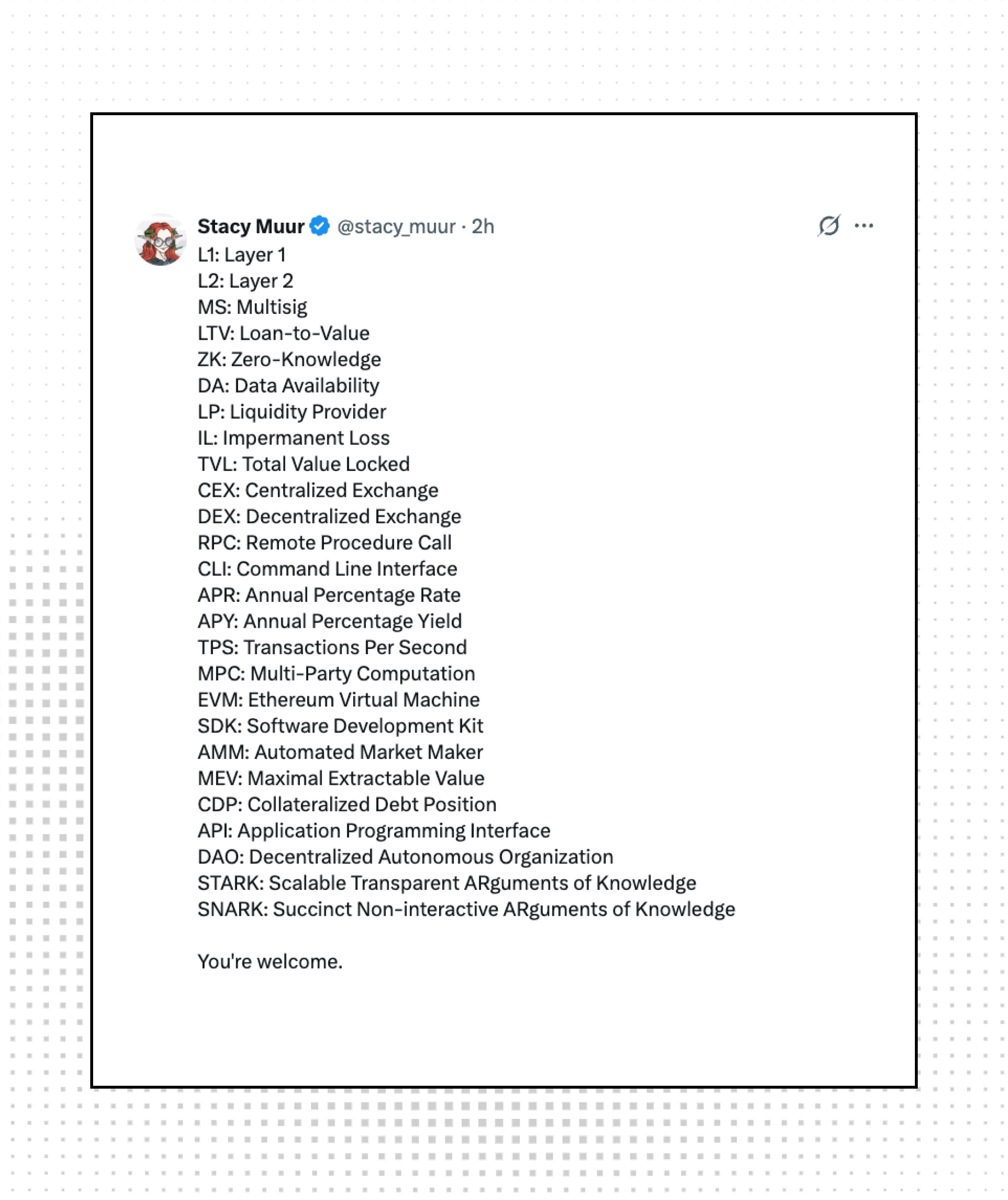 Stacy Muur drops a full crypto abbreviation glossary so you never have to pretend you know what MPC stands for again. One of the most consistent researchers in the space doing what she does best: making crypto more accessible.